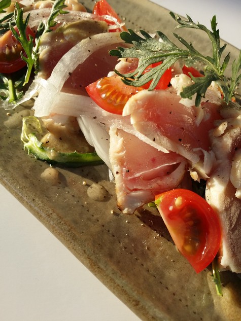 ビンチョウマグロのたたきと新玉ねぎ・春菊・トマトのサラダ